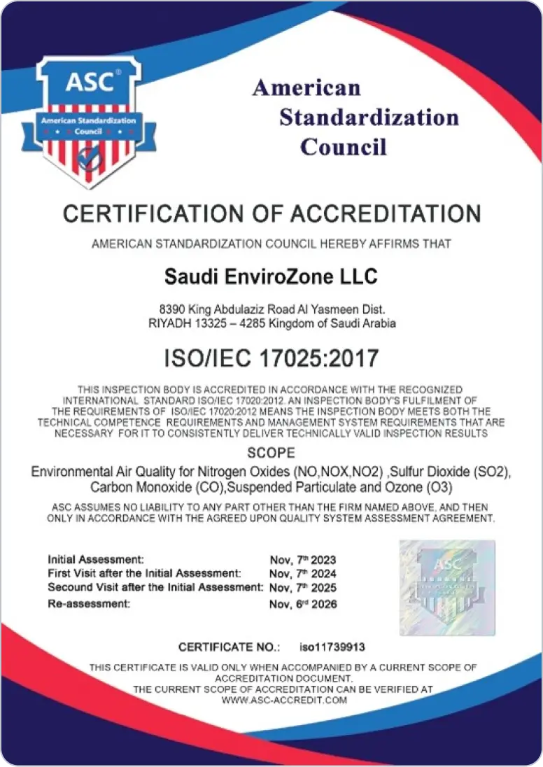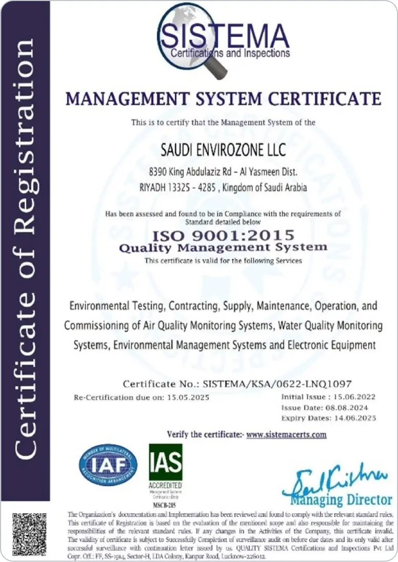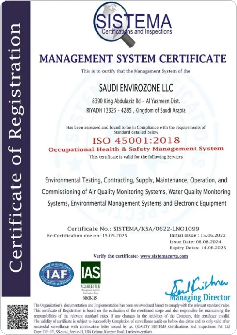Saudi Envirozone is an ISO 9001, ISO 14001, ISO 45001 and ISO 17025 certified company.